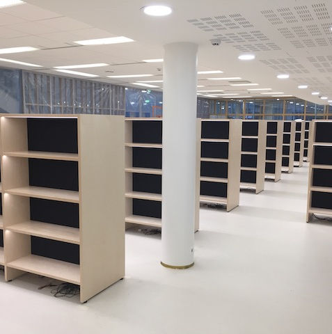 Kirjahyllyjen rakenteet valmistettiin 30 mm paksusta koivuviilutetusta MDF-levystä, ja ne varustettiin kiinteillä hyllytasoilla. Hyllyjen taustalevyt verhoiltiin kankaalla, mikä tuo tilaan lämpöä ja akustista pehmeyttä. Lisäksi hyllyihin integroidut LED-hyllyvalot parantavat kirjojen näkyvyyttä ja luovat miellyttävän valaistuksen lukutiloihin.